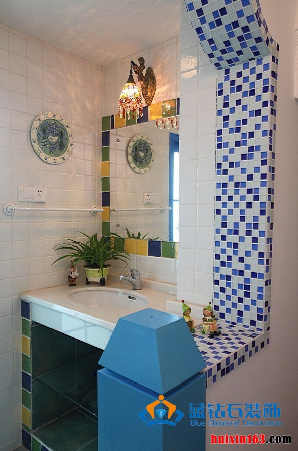 蓝色的墙漆粉饰吊顶,给人蓝天般的清新感,白色电视背景墙设计,两者形成明显对比,突显层次。手绘沙发背景墙设计,蔚蓝的海水与淡蓝的天空,画的是那样真实,海天相接,意境唯美,带给人浪漫自然之感。彩色条纹布艺沙发,白色木质结构框架,局部适当雕花设计,立体优雅。厚厚的坐垫与靠背,蓬鼓的靠枕,尽显舒适之感。拼花地面设计,蓝色小块砖块让地面呈现出丰富的变化感。蓝色小瓷砖打造的地台,与踢脚线相呼应,湖蓝色壁架设计,整体简洁明快,却体现出了浓浓的异国风情。墙壁上的拱形壁格设计,暗藏射灯,小盆栽及垂盆类植物装饰,设计手法巧妙独特,带给人清新浪漫之感。整个家居设计,处处都能感受到地中海风情的浪漫与优雅,手绘墙面真实自然,好似能感受到阵阵海风吹过,在盛夏带来丝丝清凉,让人感到清爽舒适,妙不可言。