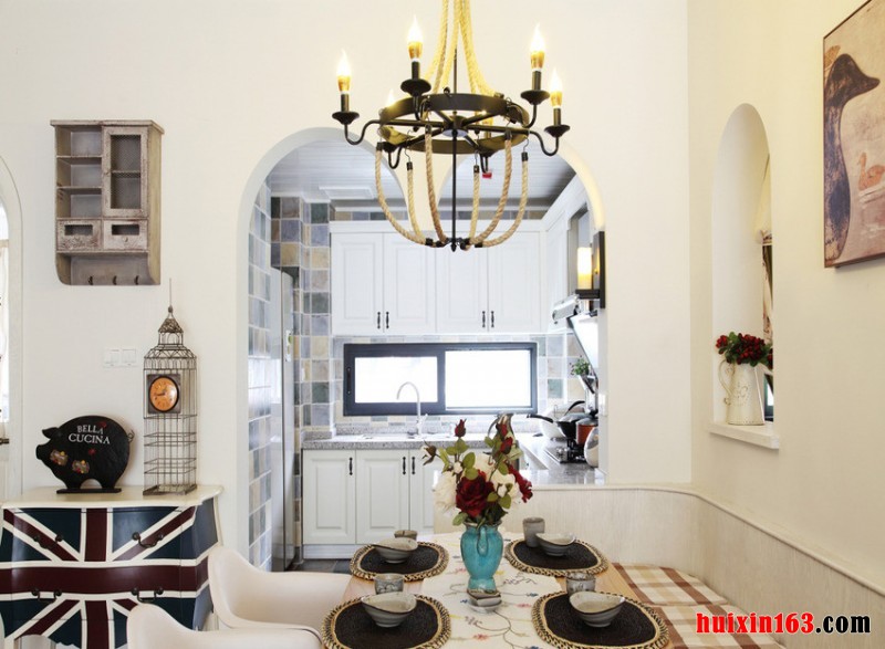 本案设计结合美式乡村风格与地中海风格,营造出了一个温馨浪漫的家居氛围。白色是本案家居设计的主要色调,客厅内,平面式吊顶,铁艺烛台式吊灯装饰,清新雅致。沙发背景墙上掏出来了一个窗户,可以看到休闲室内的景象,增加了室内的通透性,加上开放式的空间结构设计,让家居显得宽敞明亮。窗台绿植装饰,带给人自然的清新美感。米色简约沙发,花纹靠枕装饰,增添活泼生动之感。在本案家居中,随处可见清新的绿植和娇艳的鲜花,因为他们最能体现自然的清新与活力,家居中多摆放些花花草草,不仅可以美化家居,也可以舒缓心情,那翠绿欲滴的颜色,那清新美艳的花朵,总能将心底的烦扰暂抛脑后,尽情感受大自然的美妙与神奇。餐厅卡座设计,节约了空间也合理利用了空间。休闲区圆形桌面及卡座设计,格子窗帘搭配小巧可爱的绿色盆栽,闲暇时坐在这里喝喝茶、看看书,那将是多么的惬意与舒心。