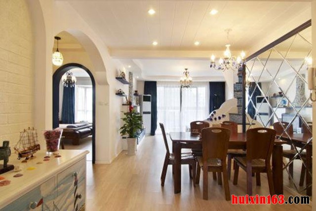对于地中海风格家居,最吸引人也最浪漫的莫过于蓝白两色搭配的风格,加上细小的石砾和别致的拱廊设计,尽情散发地中海风格的独特魅力。在地中海风格家居设计中,彩色搭配一定要直逼自然,才能给人清爽舒适的感觉,本案设计色彩主要有白色、蓝色、黄色、绿色、土黄色及红褐色,这些颜色最能体现大自然也是大自然中最常见的颜色,他们之间怎么搭配都不能带来大自然的清新感觉。蓝色马赛克楼梯设计,柔美流畅的曲线,逐级向上,给人清爽舒心的美好感觉。楼梯下面便是客厅,空间虽小但是很温馨,大大小小的照片装饰背景墙,极富艺术感,深蓝色布艺沙发,白色轮廓走线突出沙发的立体。壁炉造型电视背景墙,设计,多彩的石砾堆砌而成的烟道,精美别致。壁架装饰墙面,美观且实用。江海洋元素带入到家居中,装饰了家居,也带了人浪漫自然的感觉。