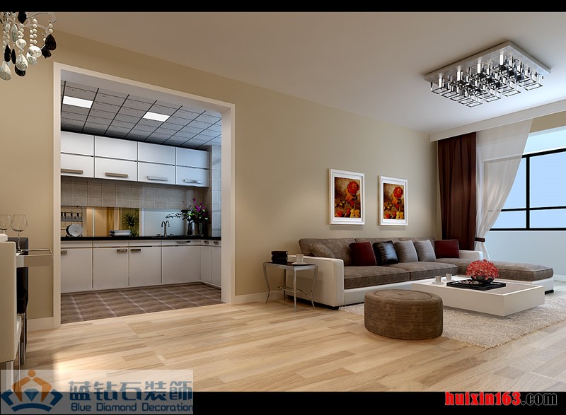 康河新城-103平米-二居室-现代简约风格装修效果图--厨房、客厅