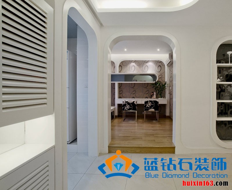 本案家居设计注重圆角造型设计,可谓是将圆角的概念发挥到了极致,在本案家居中,随处都可以看到圆角造型的东西出现,玄关处鞋柜,底部圆角设计,正对着的门口及书桌背景墙,也是圆角设计,给人层层相应的感觉,有种延伸般的透视感。电视背景墙设计,无论是造型还是墙纸,亦或是电视柜,均采用圆角设计,毫无生硬之感,让人感受到了柔和婉约之美。电视背景墙设计将门口也纳入气质,整个背景墙设计极富艺术美感,个性时尚,别开生面。茶几设计与电视柜造型相似,相辅相成,整体感觉更显和谐。棕色软包布艺沙发,造型简约稳重,花纹靠枕装饰,使得沙发不会显得过于单调空荡,家居主人的结婚照装饰着沙发背景墙,洋溢着浪漫甜美的味道。门厅往客厅过渡出设计了简约的吧台,造型个性别致。黑白相间的马赛克墙砖贴饰墙面,经典而时尚的配色,时尚前卫。吊顶上设计根据吧台的走势勾勒,上下交辉,独具风味,与本案电视背景墙设计同为本案家居设计的亮点所在。