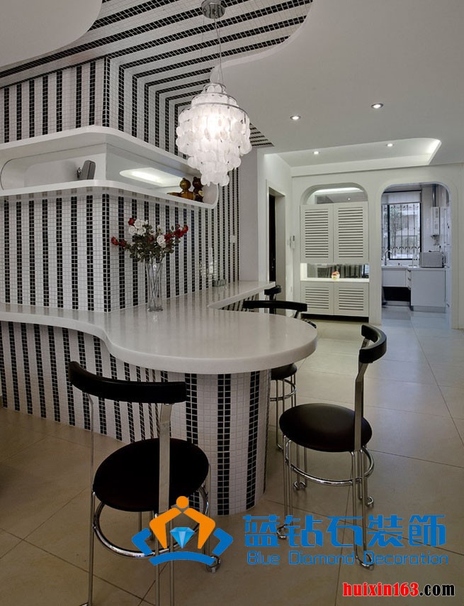 本案家居设计注重圆角造型设计,可谓是将圆角的概念发挥到了极致,在本案家居中,随处都可以看到圆角造型的东西出现,玄关处鞋柜,底部圆角设计,正对着的门口及书桌背景墙,也是圆角设计,给人层层相应的感觉,有种延伸般的透视感。电视背景墙设计,无论是造型还是墙纸,亦或是电视柜,均采用圆角设计,毫无生硬之感,让人感受到了柔和婉约之美。电视背景墙设计将门口也纳入气质,整个背景墙设计极富艺术美感,个性时尚,别开生面。茶几设计与电视柜造型相似,相辅相成,整体感觉更显和谐。棕色软包布艺沙发,造型简约稳重,花纹靠枕装饰,使得沙发不会显得过于单调空荡,家居主人的结婚照装饰着沙发背景墙,洋溢着浪漫甜美的味道。门厅往客厅过渡出设计了简约的吧台,造型个性别致。黑白相间的马赛克墙砖贴饰墙面,经典而时尚的配色,时尚前卫。吊顶上设计根据吧台的走势勾勒,上下交辉,独具风味,与本案电视背景墙设计同为本案家居设计的亮点所在。