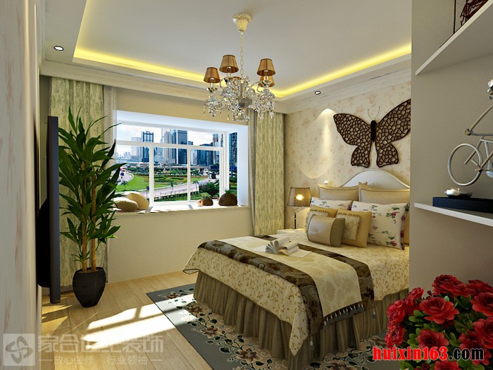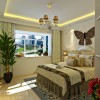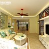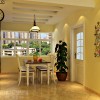 几何线条打造的客厅吊顶,圆角设计让吊顶看上去更显柔和。深木色吊扇灯设计,四周暖色灯带搭配,加上浅黄色墙漆粉饰墙面,整个家居给人一种暖意融融的舒适感。深色墙砖贴饰而成的电视背景墙,白色木质板条搭配,造型小巧精致的墙壁灯及钟表摆件装饰,给人朴实雅致之感。仿古砖铺地,总能给人一种质朴自然的感觉。碎花布艺沙发,白色木结构框架,花纹靠枕装饰,给人的感觉是那样温馨舒适、朴素淡雅。条纹壁纸装饰沙发背景墙,装饰画装饰背景墙,黑色的画框让装饰画显得立体,装饰画色彩丰富艳丽,不仅丰富了背景墙,也为家居增添了不少活泼生动且浪漫的感觉。