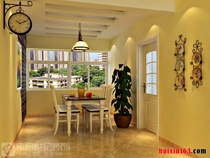 几何线条打造的客厅吊顶,圆角设计让吊顶看上去更显柔和。深木色吊扇灯设计,四周暖色灯带搭配,加上浅黄色墙漆粉饰墙面,整个家居给人一种暖意融融的舒适感。深色墙砖贴饰而成的电视背景墙,白色木质板条搭配,造型小巧精致的墙壁灯及钟表摆件装饰,给人朴实雅致之感。仿古砖铺地,总能给人一种质朴自然的感觉。碎花布艺沙发,白色木结构框架,花纹靠枕装饰,给人的感觉是那样温馨舒适、朴素淡雅。条纹壁纸装饰沙发背景墙,装饰画装饰背景墙,黑色的画框让装饰画显得立体,装饰画色彩丰富艳丽,不仅丰富了背景墙,也为家居增添了不少活泼生动且浪漫的感觉。